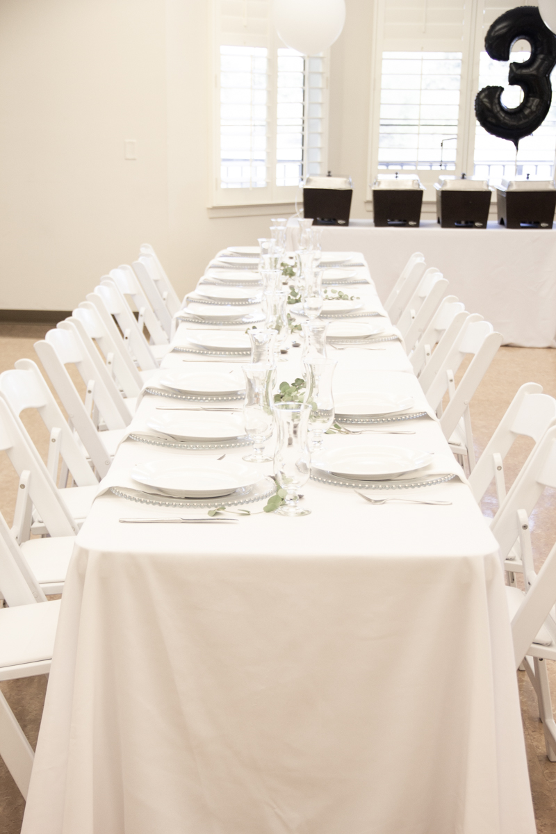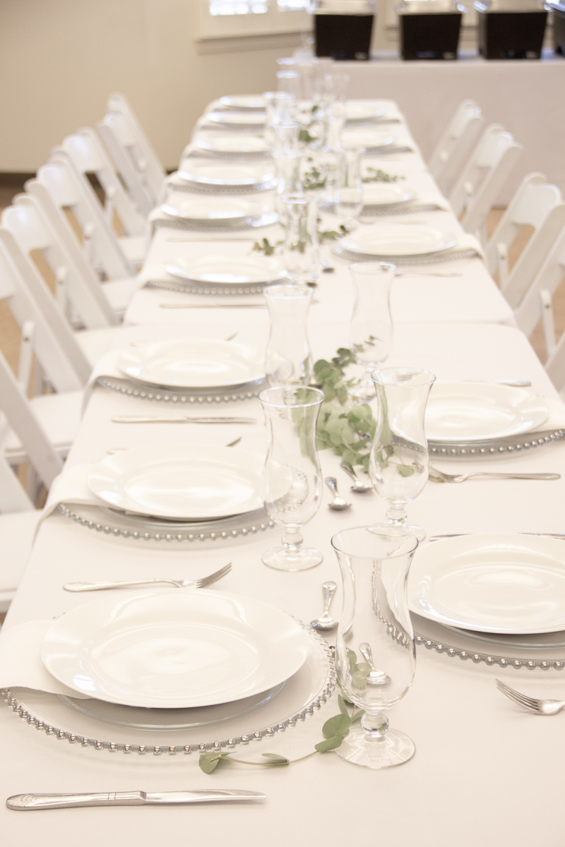 The style that we went with is classical white, simple and elegant. Using our white table linens, white folding chairs, silky white napkins and white dinner plates.  A  silver beaded glass charger was added to give that elegant look, yet  kept at a  minimal level.