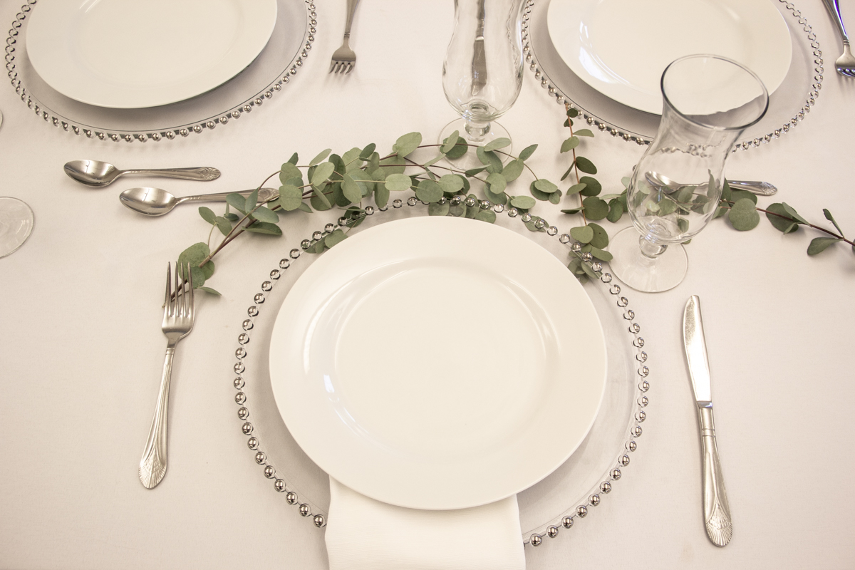 Using traditional silver flatware is a perfect match with the silver beaded glass chargers.