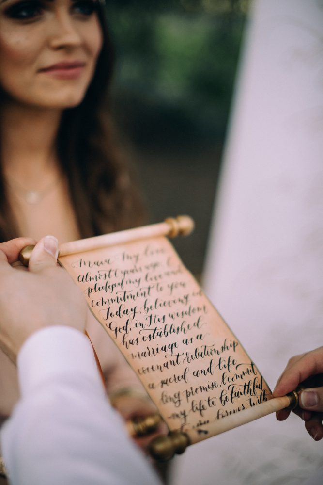 Whether you’re planning for boho wedding or vow renewal you need to have calligraphy! The gorgeous work done by Ashley Baumgartner paired so well with the overall airy and effortless look we were going for. The beautiful part of having custom calligraphy is that you can make your event very personalized and truly reflect you and your love! The ceremony backdrop was handwritten by Ashley and it was the couple’s favorite love poem. Having written out vows of course is an absolute must at a wedding or vow renewal but we decided to take it a step further and use scrolls to add more of a middle eastern and bohemian touch. The vows turned out so beautiful and eclectic on the stained scrolls!