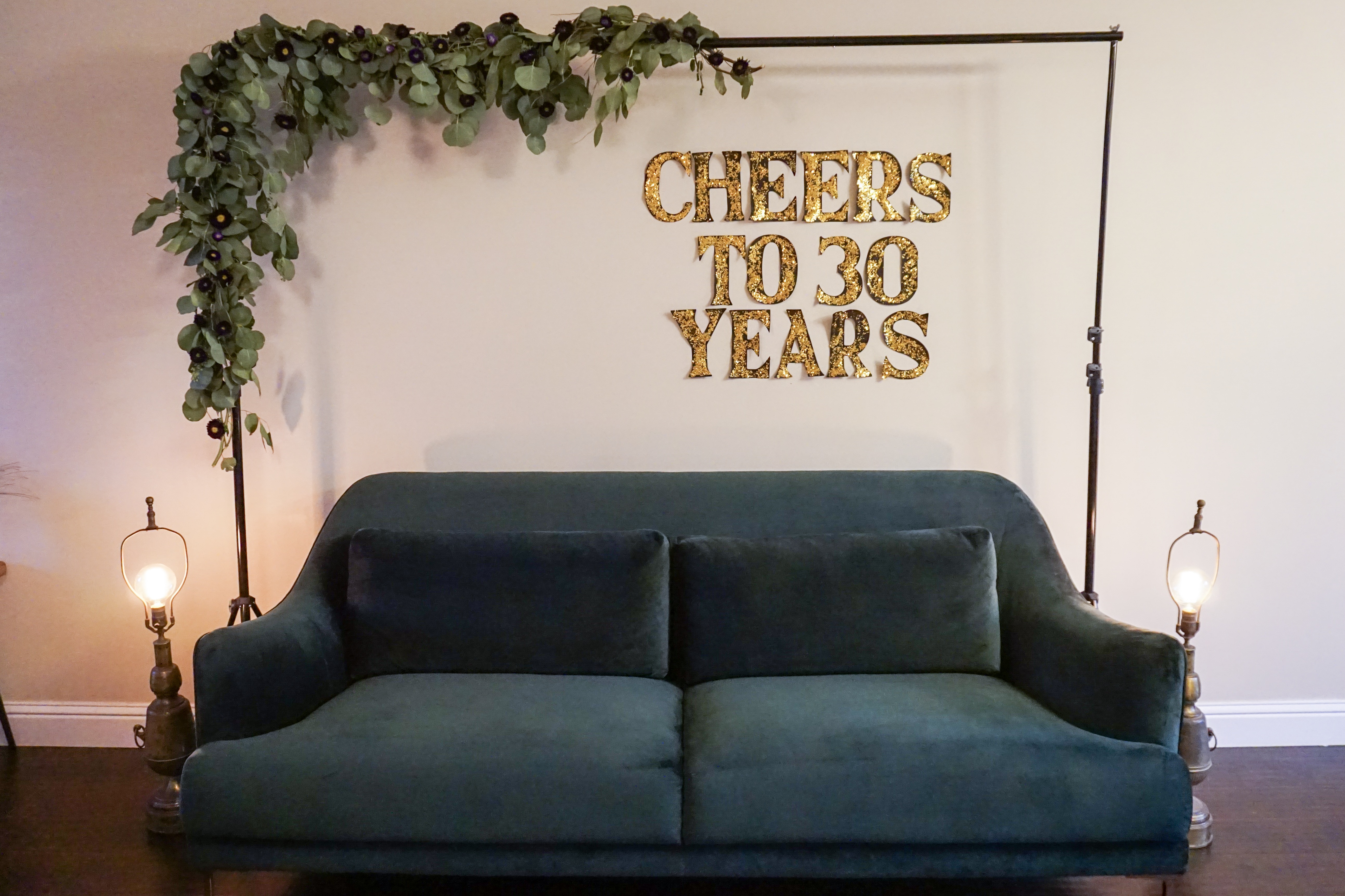 Now I had to come up with some type of photo booth where I can take photos of my girls with their guests. I really wanted to do something floral and ended up using a bouquet of purple flowers I got at Safeway and Eucalyptus for the base. I tied the Eucalyptus to the stand and then just stuck the flowers in randomly. The “Cheers To 30 Years” sign was also made with my Cricut, a very simple and quick DIY. I used Cricut to cut the letters and then added sparkles using glue.