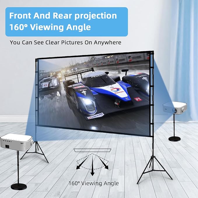 Portable movie projector and 120″ screen for indoor/outdoor use.