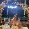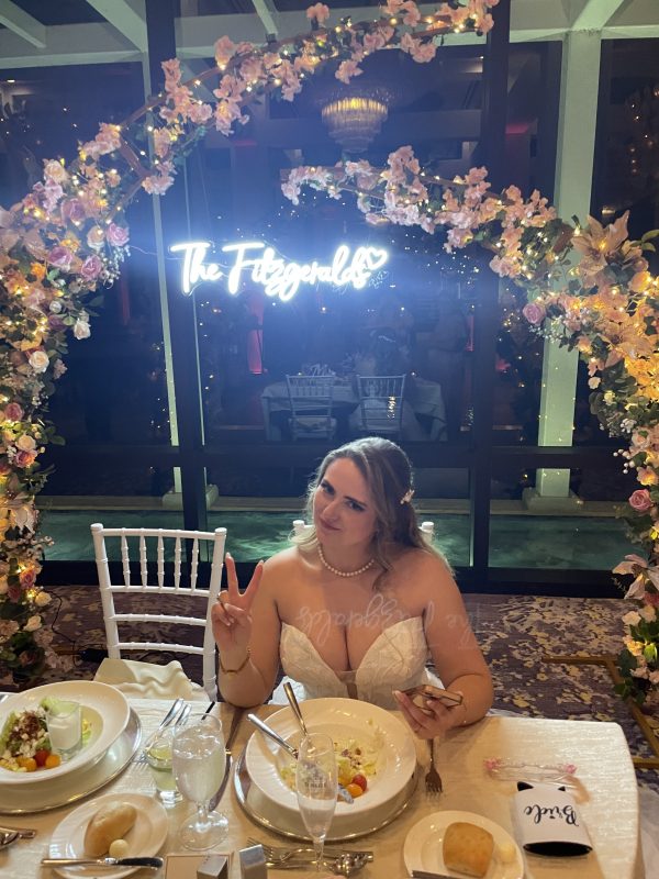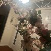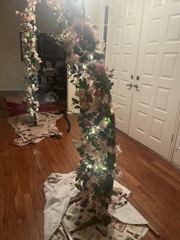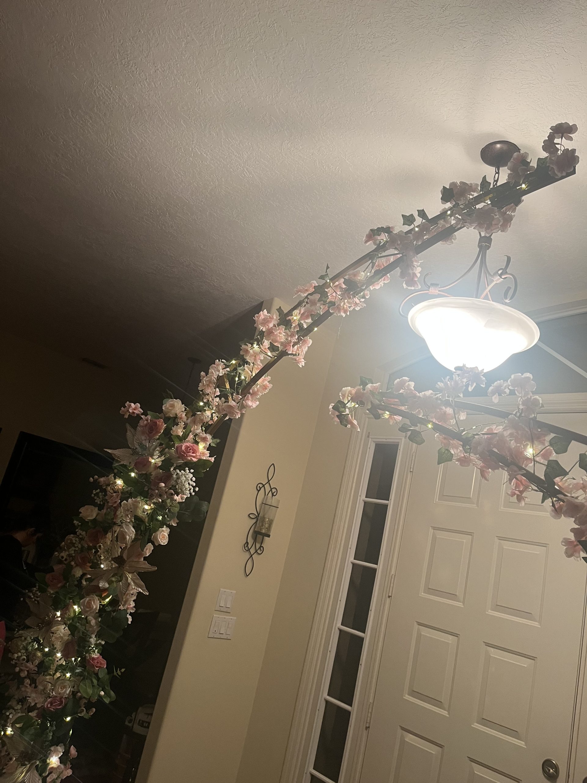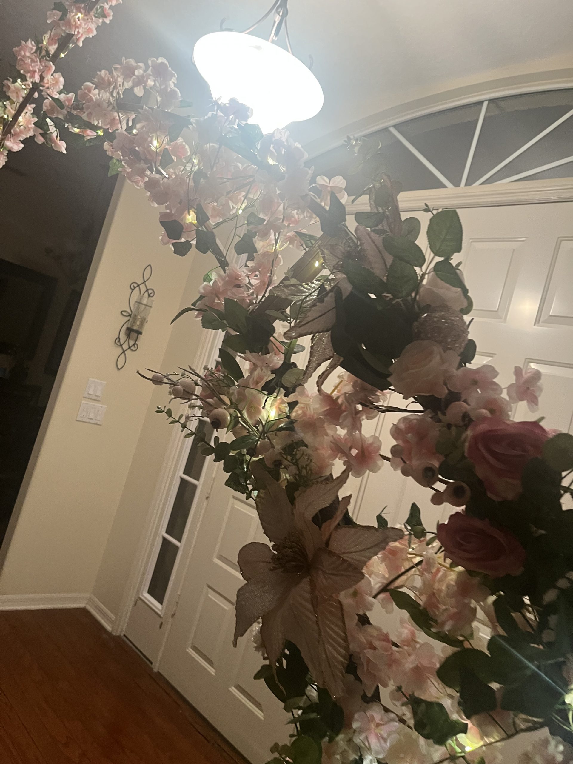 Faux cherry blossoms, champagne roses, pink roses, and various greenery with sparkly touches