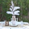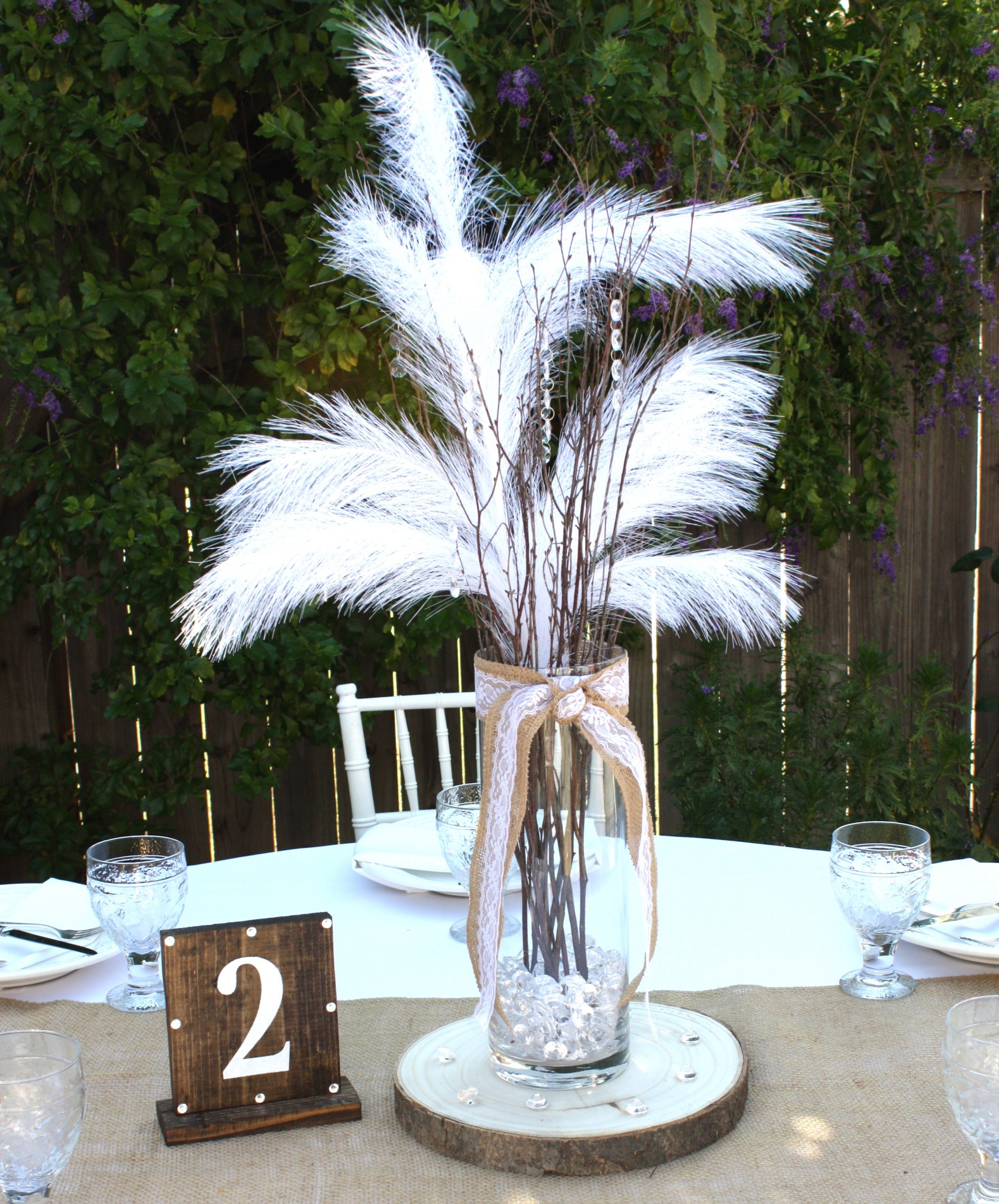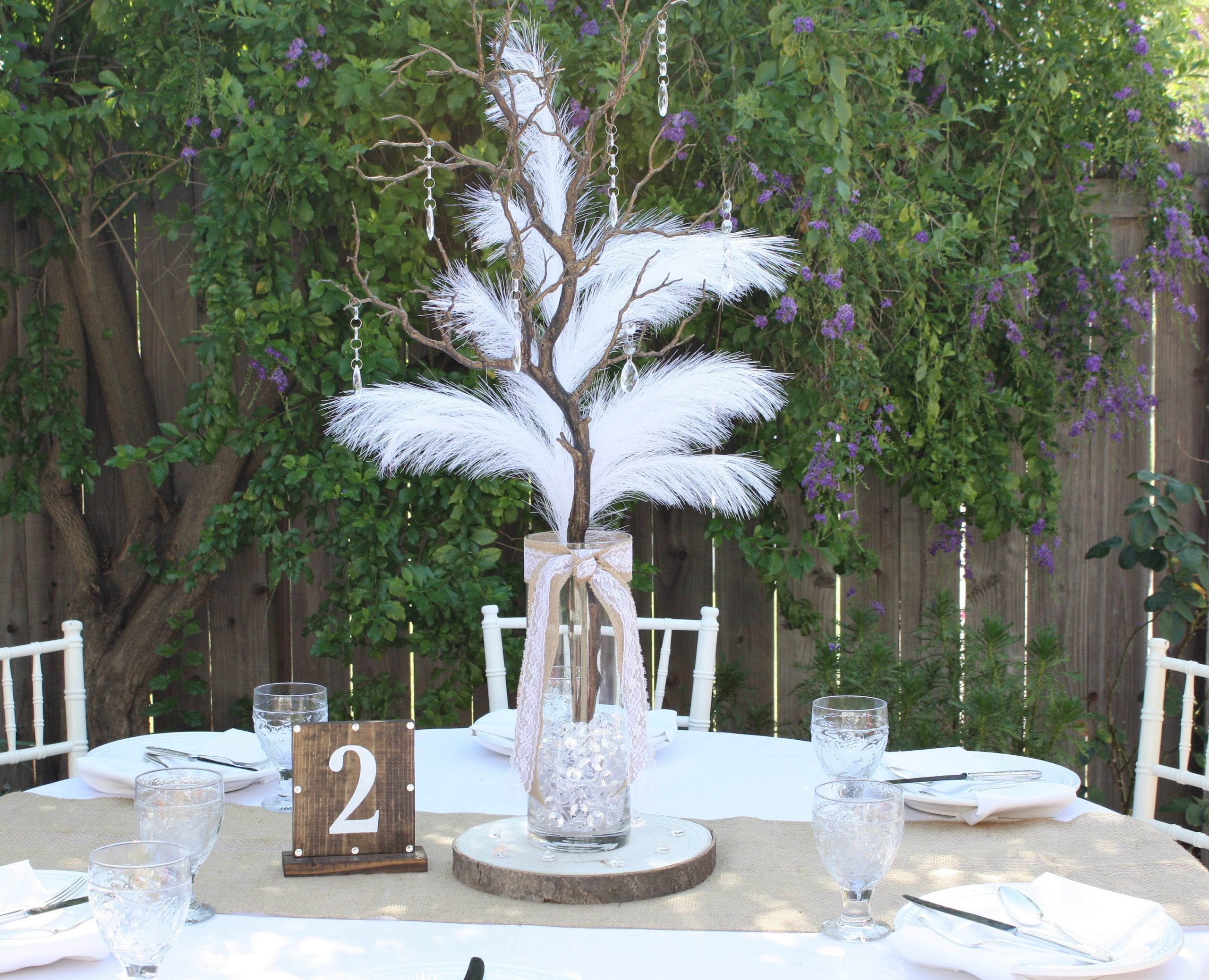 Each centerpiece comes with a wood table number that is stained dark walnut. Table numbers are hand painted in white and embellished with a rhinestone border.