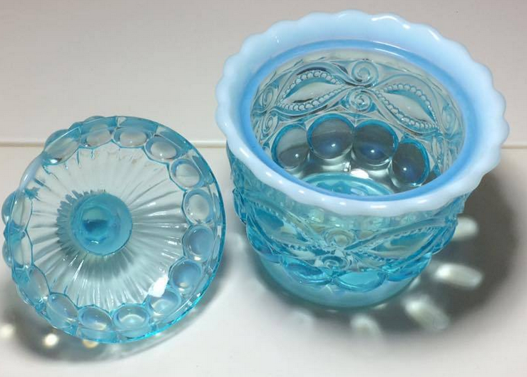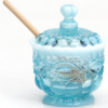 Opalescent Blue Honey Pot w/wooden dipper $35.00 ea.