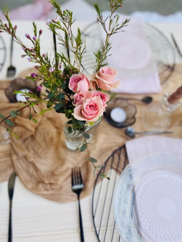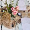Assorted small glass bud vases are a fun way to create a flower garland to your table.