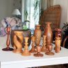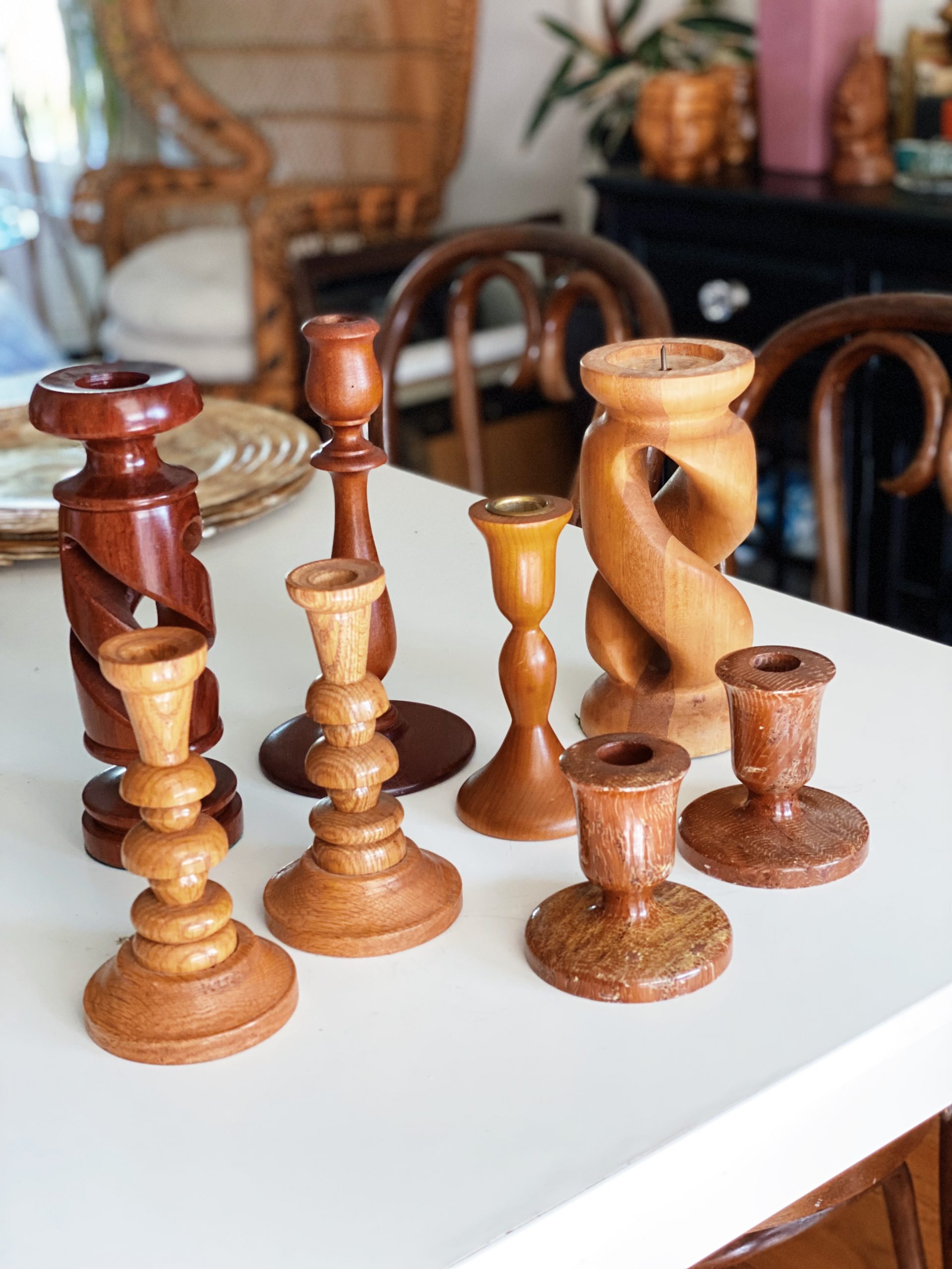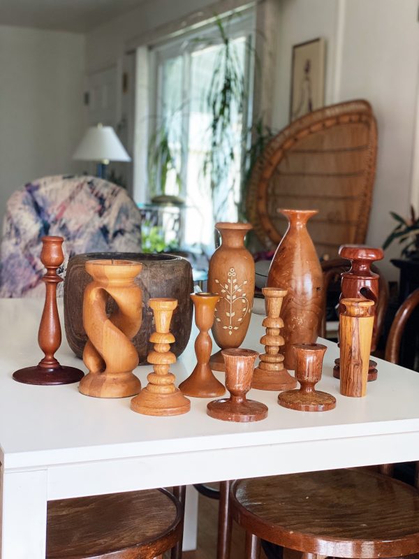 Mixed styles of solid wood candlesticks. Each are vintage and unique in its own right, but together they make a standout tablescape. Styles and wood type varies. 2-7″ in height and takes 1″ candles. Dripless candles are recommended. Candles are not included. Contact us for more available vintage furniture and decor!