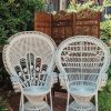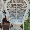 White Elephant Co. Event Rentals – “The Olin” White Peacock Chair rental. All white wicker rattan peacock chair with ornate fan back seat. A gorgeous addition to any event. *PLEASE NOTE* – “The Olin” is shown as the chair to the RIGHT in photos. Contact us for more available vintage furniture and decor!