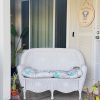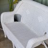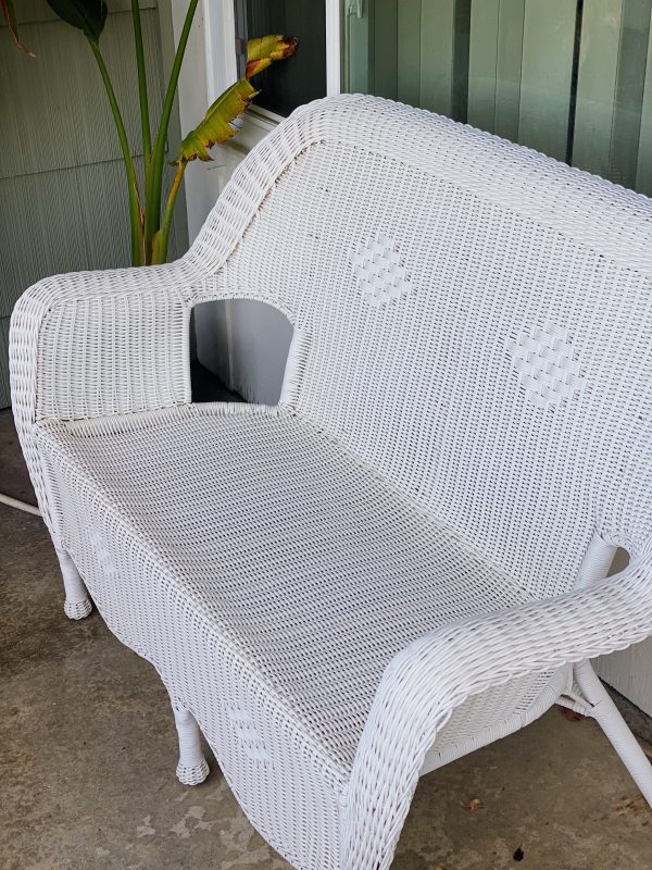 Beautiful white resin wicker loveseat, seats two comfortably. Made of durable plastic-resin (not actual wicker); lightweight yet sturdy. Cushion is optional. Use this for your party, photoshoot, wedding, interior styling needs, or staging. Contact us for more available vintage furniture and decor!