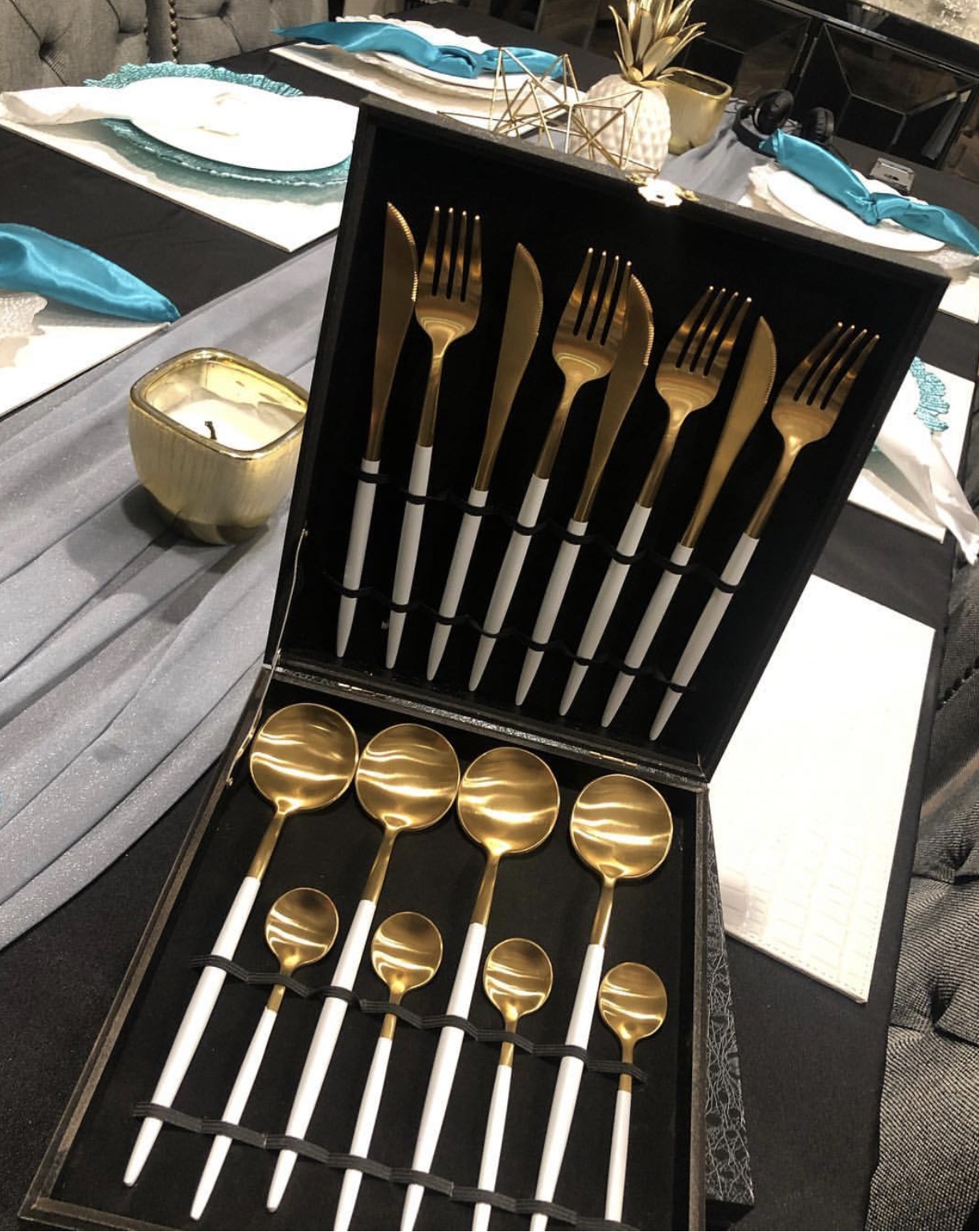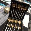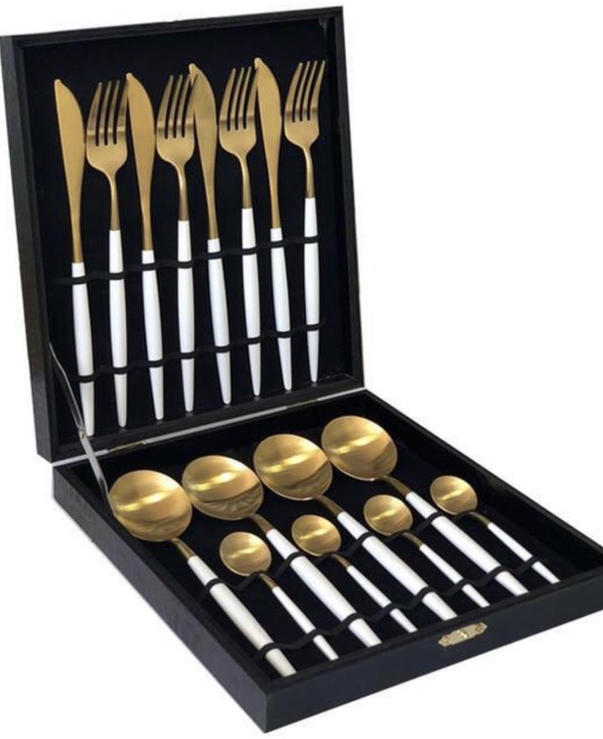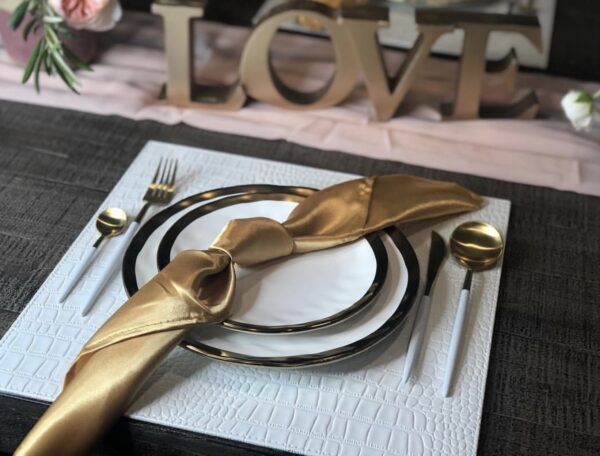 Utensils – Beautiful White and Gold utensils (fork, knife, big spoon, small spoon) in the set 4 pieces.