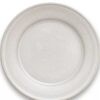 A simple cream colored dinner plate. It is made out of plastic and bamboo.