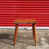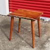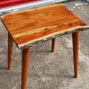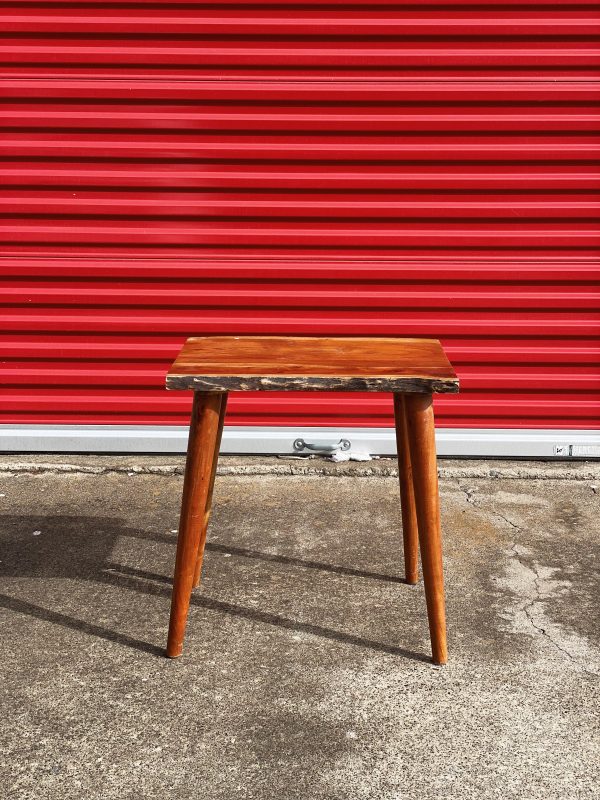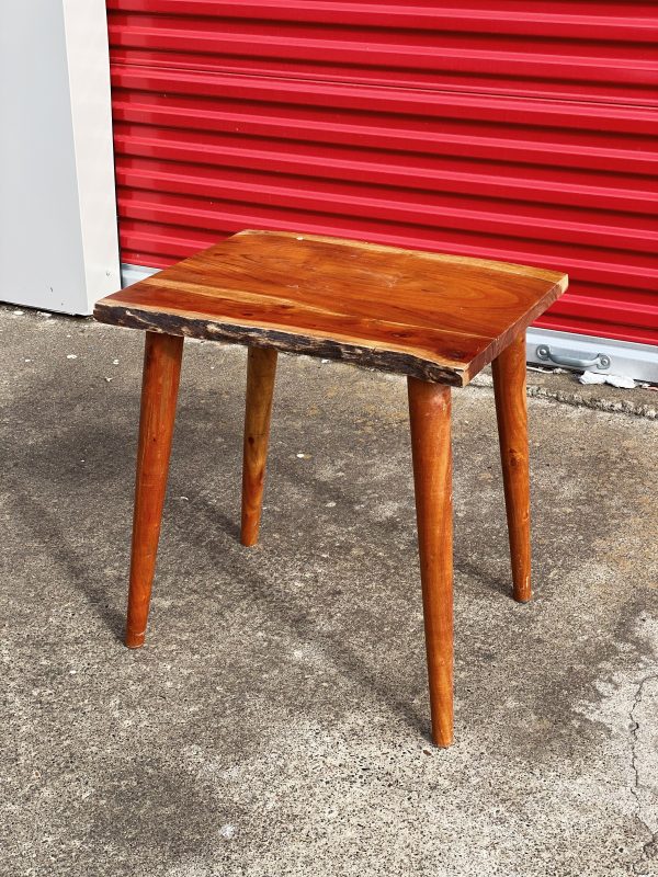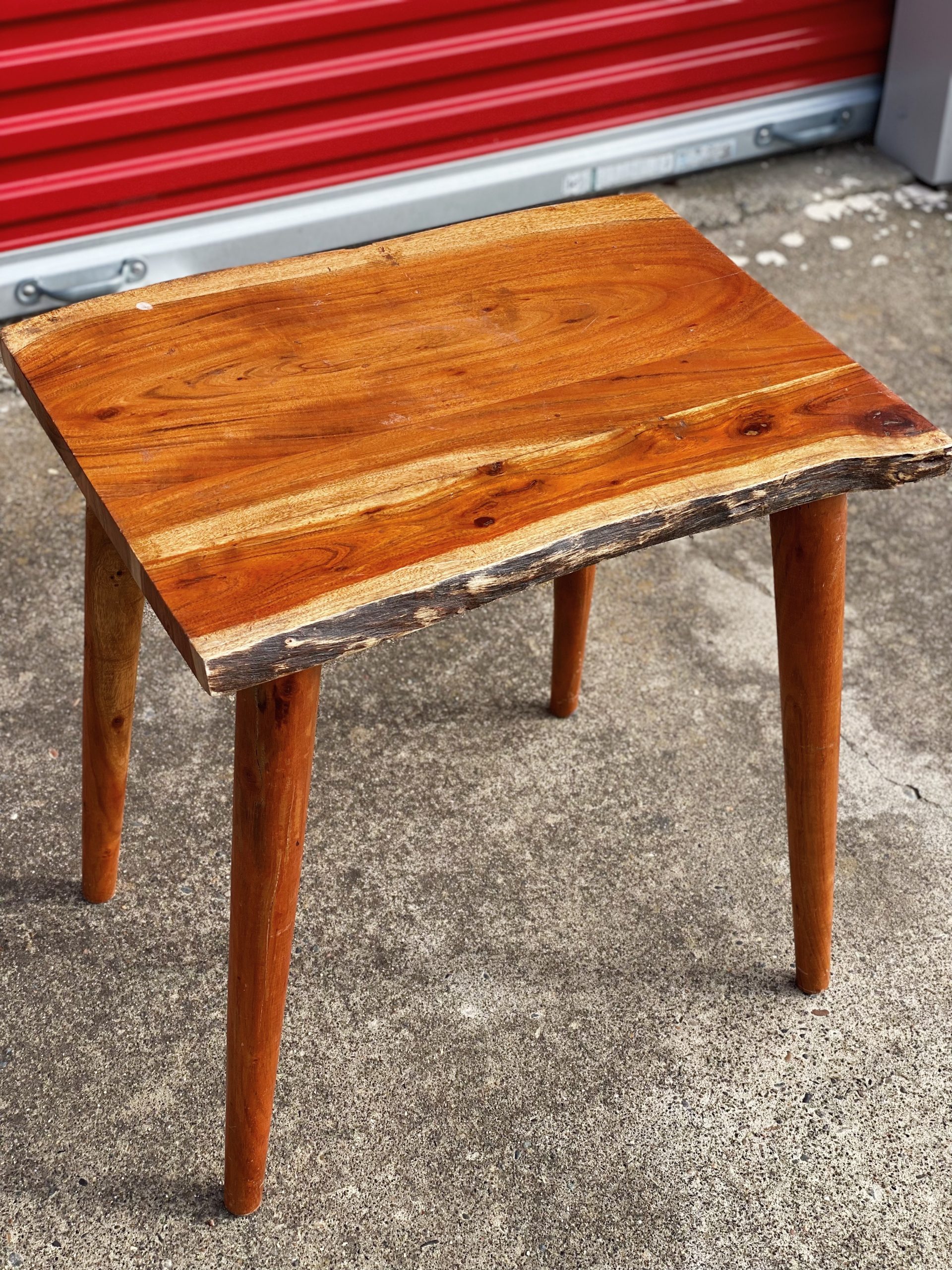 Rectangle shaped Acacia wood side table with live edge design. Thick wood and sturdy, a perfect accent/side table for your styling needs. Wood should be protected with a barrier if there are pots or vases with water set on it. Contact us for more available vintage furniture and decor!