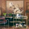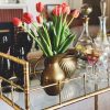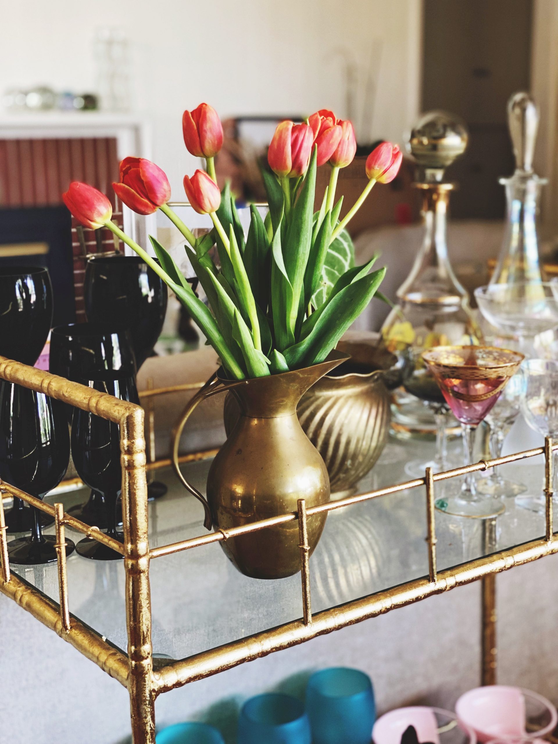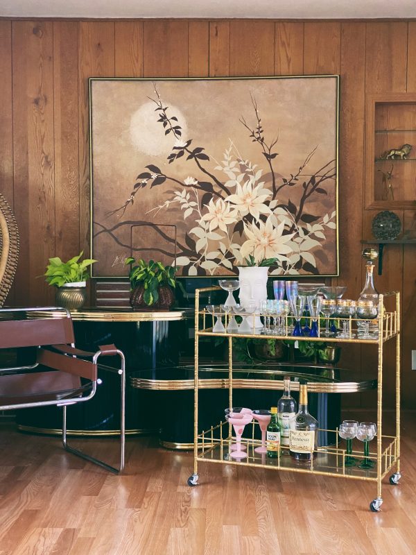 Hollywood Regency gold glam bar cart. Gold faux bamboo metal frame with two tiers of glass shelving. Great for your special occasion or styling needs. Bar cart party wedding prop rental. Contact us for more available vintage furniture and decor!