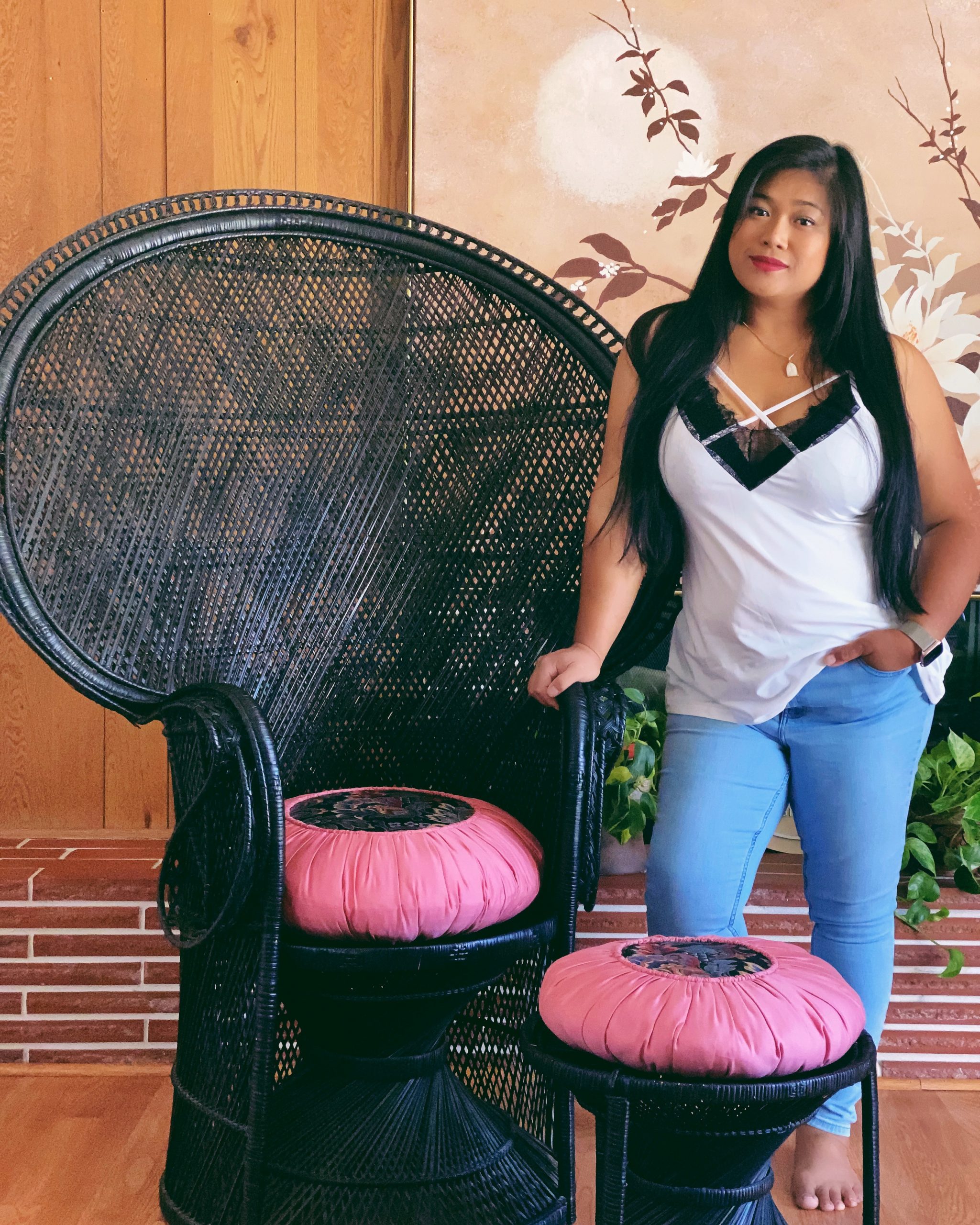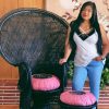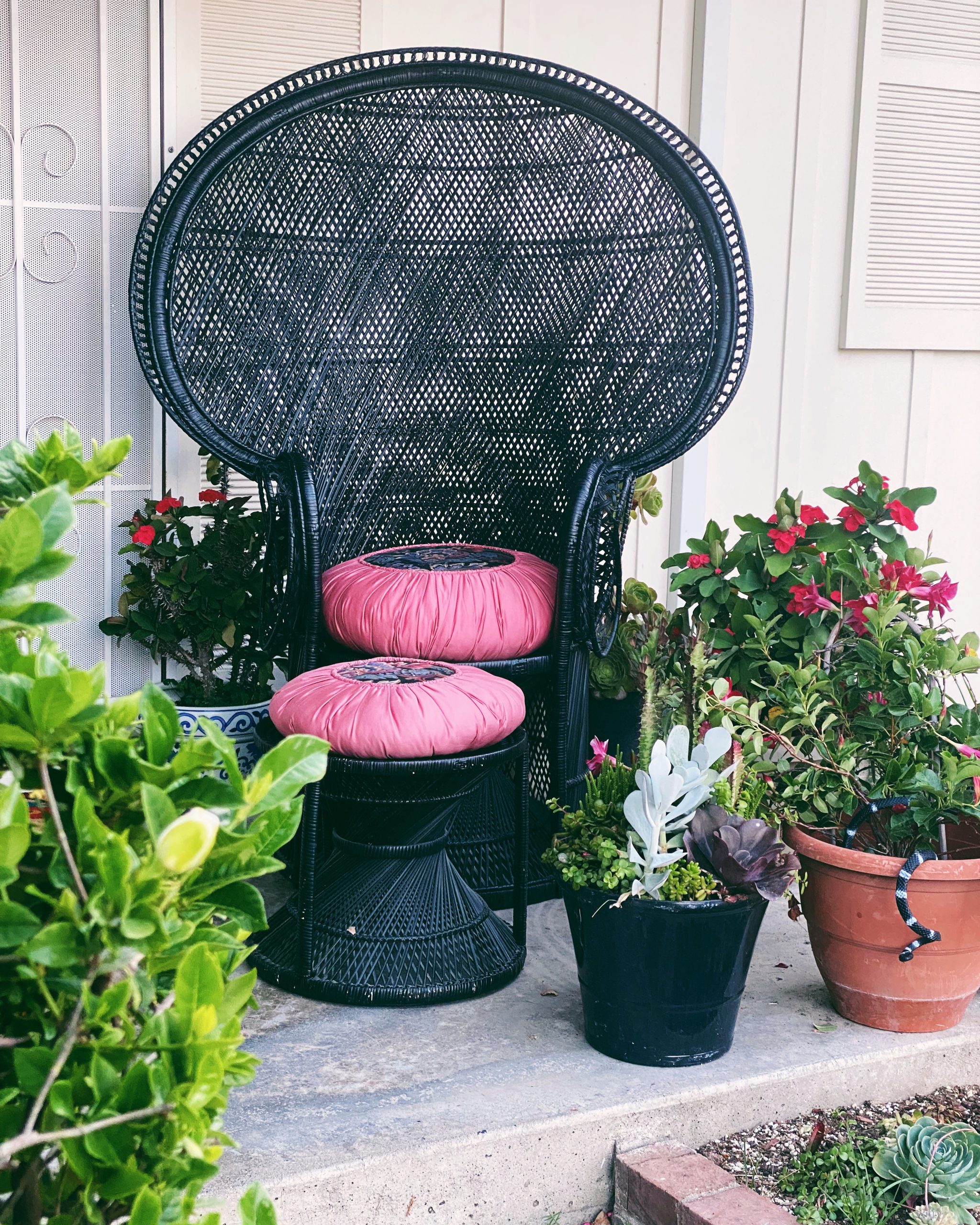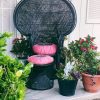White Elephant Co. Event Rentals – Vintage Black Peacock Chair. Large vintage peacock chair with fan back and black painted body. Beautiful and grand peacock chair throne. Does not include footstool. Contact us for more available vintage furniture and decor!