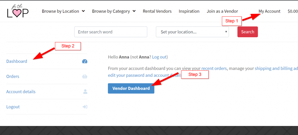Or in your “My Account” page click on Dashboard and then Vendor Dashboard.