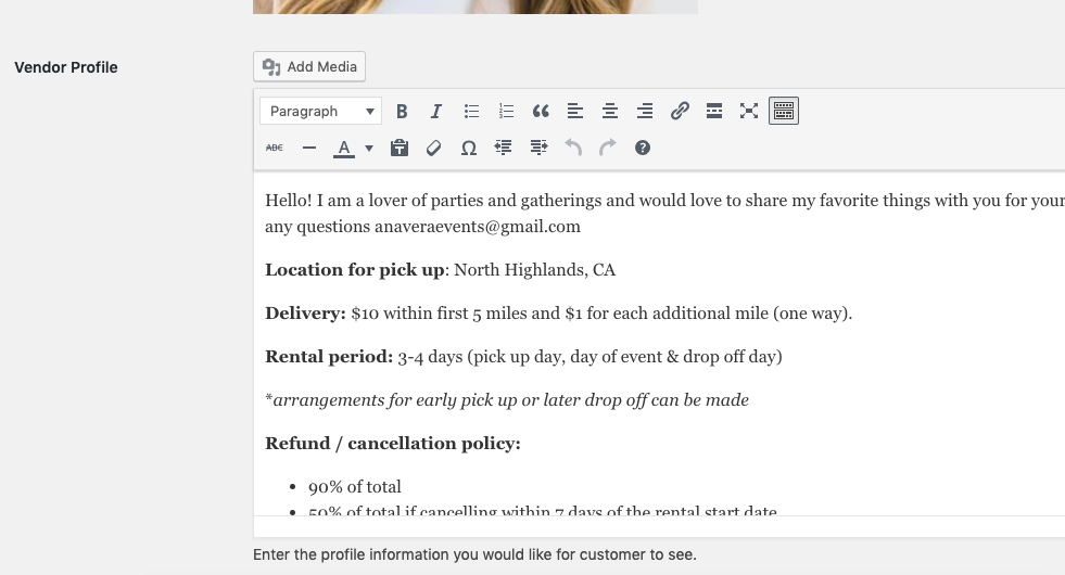 We encourage you to put in more info about yourself. A great description builds trust and results in more rentals. Clients love dealing with a fun individual. If you are supporting a charity, love animals, have a passion for weddings – share it!