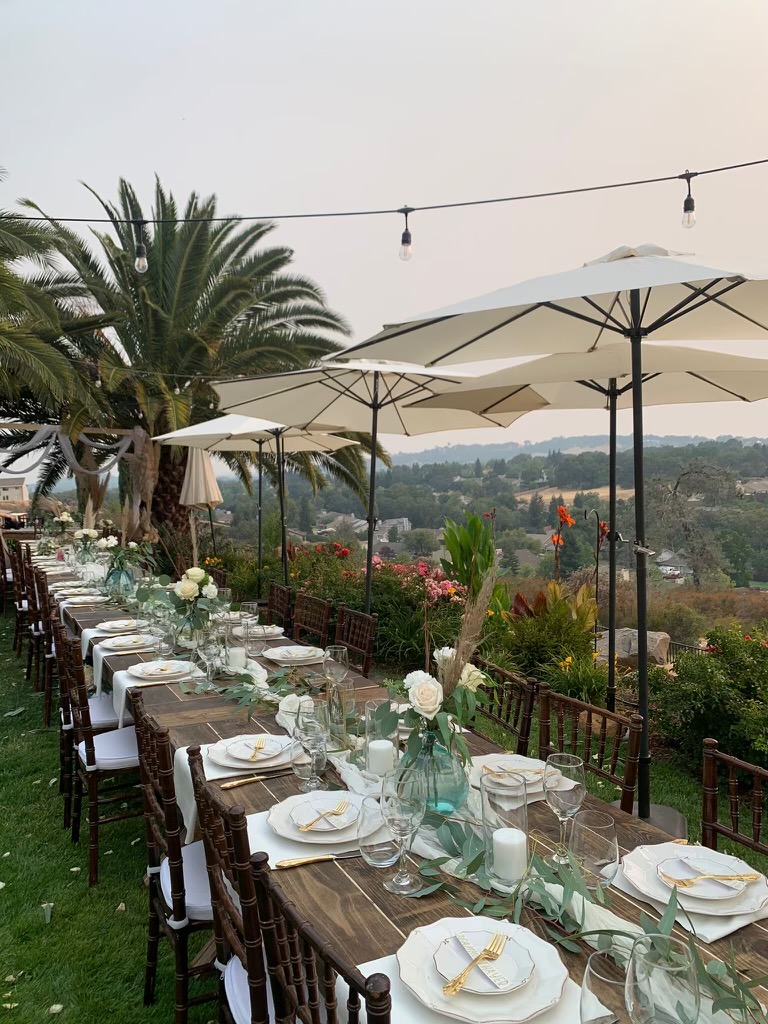 Wooden tables, chairs, backdrops, dinnerware, runners, cloth napkins.